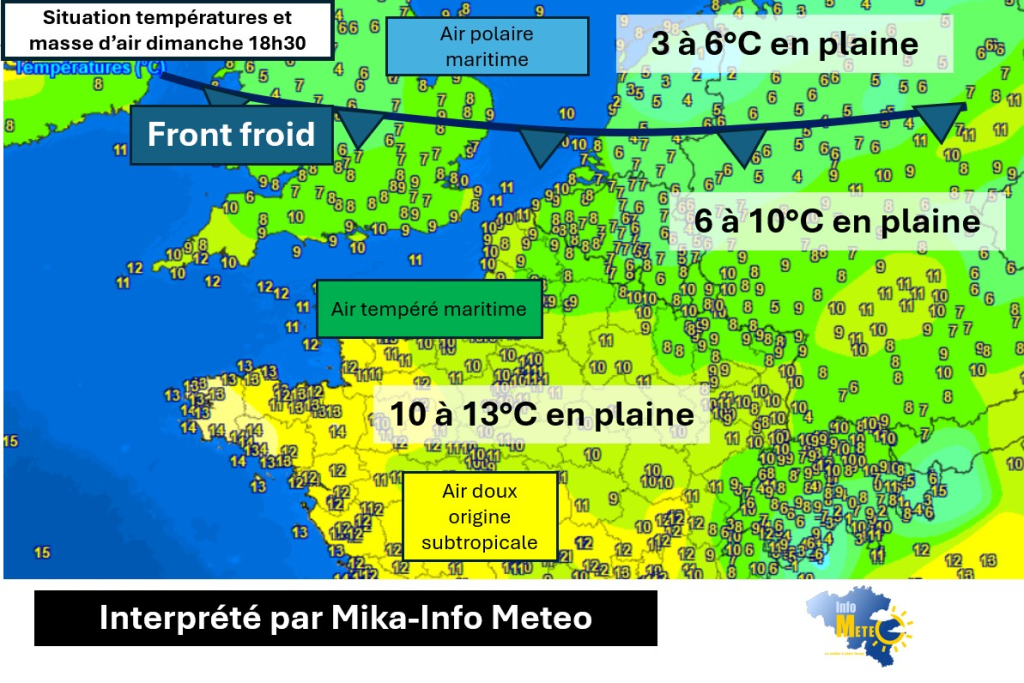 Après la pompe à douceur c'est la clim' qui se met en marche avec l'arrivée de cet air polaire par le nord à l'arrière du front froid peu actif qui passera cette nuit.