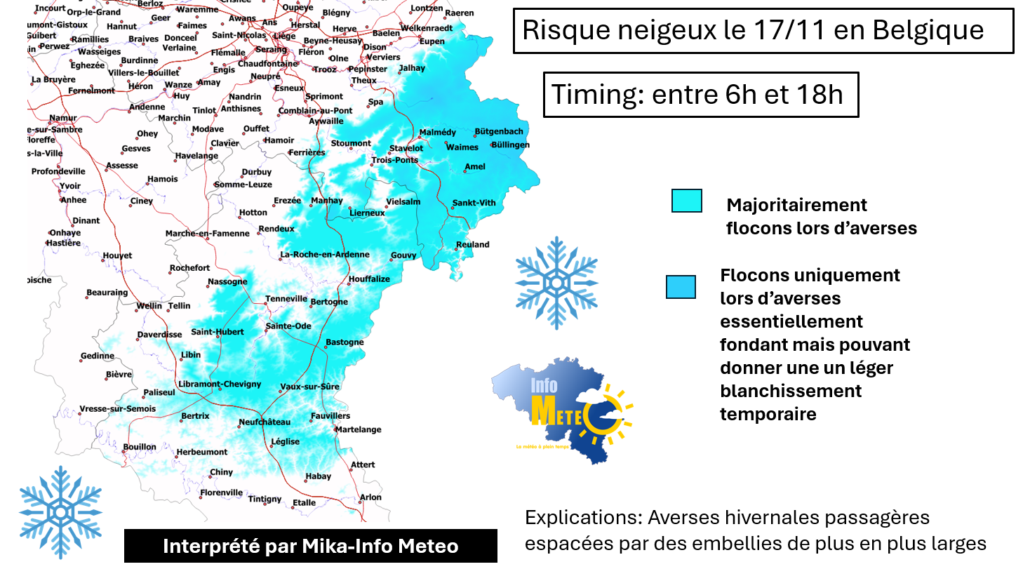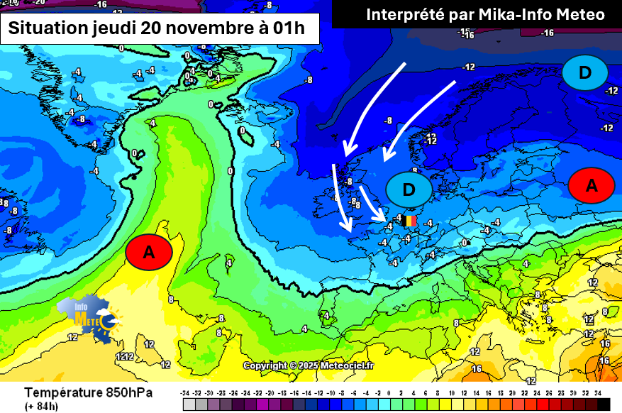 Il sera suivi dès demain par de l'air se déstabilisant sur la mer du nord encore douce, elle atteint encore 13-14°C à cette période de l'année, c'est un fameux gradient thermique car à 1300m d'altitude il fera environ -3/-4°C. En Laponie, c'est carrément l'hiver qui a brusquement débarqué ces derniers jours avec de 20 à 40cm de neige et des températures qui affichent en ce moment de -10 à -20°C sur ces régions. L'air polaire vadonc finalement débarquer ces toutes prochaines heures, il sera d'origine maritime, moins froid qu'en Scandinavie mais tout-de-même suffisamment que permettre aux averses de prendre un caractère hivernal sur les reliefs dès 350-450m essentiellement voire ponctuellement jusqu'en plaine sous forme de giboulées jeudi. De plus, sur les hauteurs de l'Ardenne (>500m), une petite pellicule de neige recouvrira (c'est confirmé !) temporairement les paysages jusqu'à 5cm de mercredi à jeudi. Ces conditions instables, fait d'averses parfois hivernales et d'éclaircies plus ou moins larges, se maintiendront jusqu'en 22/23 nov puis nous retrouverons plutôt des perturbations océaniques sous des températures repartant légèrement à la hausse (comptez max 6-10°C dans le centre pour la fin novembre).